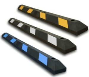 40-pound Black Rubber Parking Lot Tire Stop. 6-foot long, 6 inches wide and 4.25 inches tall. Black with colored stripes: Choose Yellow, White, or Blue reflective stripes.  $78.50